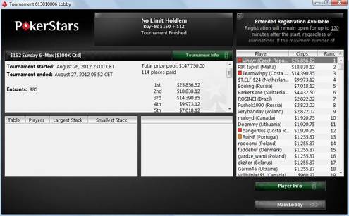 2Turnaje Sunday 6-max s buy-inem $162 a garancí $100.000 se tentokrát zúčastnilo 985 hráčů a celkový prize pool se tak navýšil až na $147.750. Nejvýraznější část si z této sumy k naší radosti ukrojil Vinkyy, který za sebou nechal všechny své soupeře a inkasoval tak $25.856.