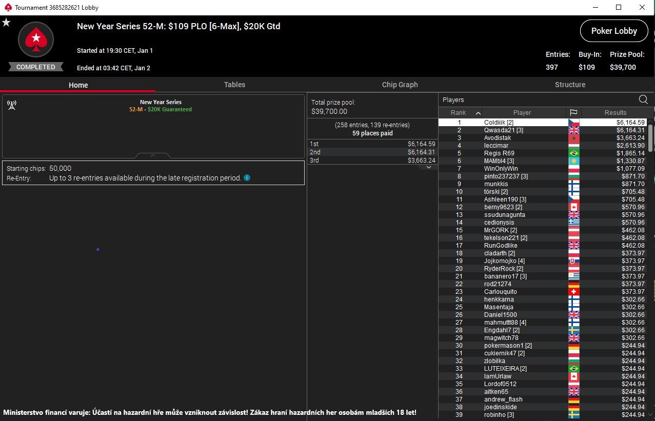"Coldiiik" zdominoval PLO event a v poli téměř 400 hráčů se stal šampionem a obsadil první příčku. Za to si odnáší $6.165 a pocit absolutního vítězství, který žádný pokerový hráč nezažívá na denní bázi.