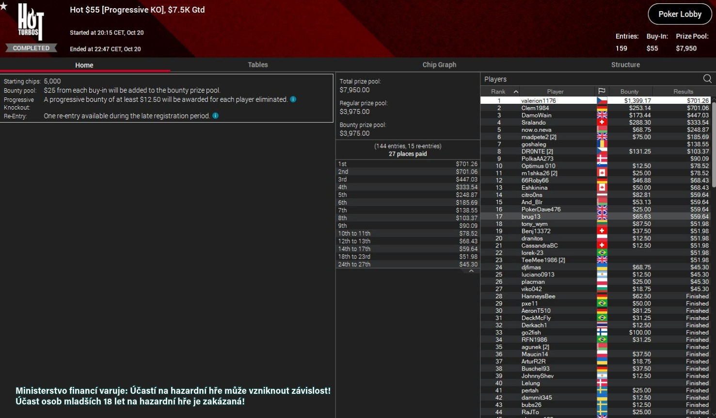 Další trefu přidal "valerion1176", který za sebou nechal všechny protihráče v turnaji Hot $55 (PKO), kde se hrálo o GTD $7.500. Do bankrollu poslal $2.100 (bounty $1.399 + $701).