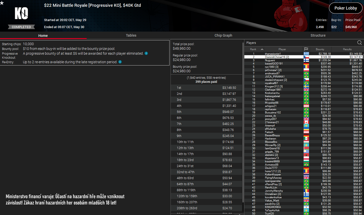 DominikChmiel16 skončil druhý v $22 Battle Royal s GTD $40.000