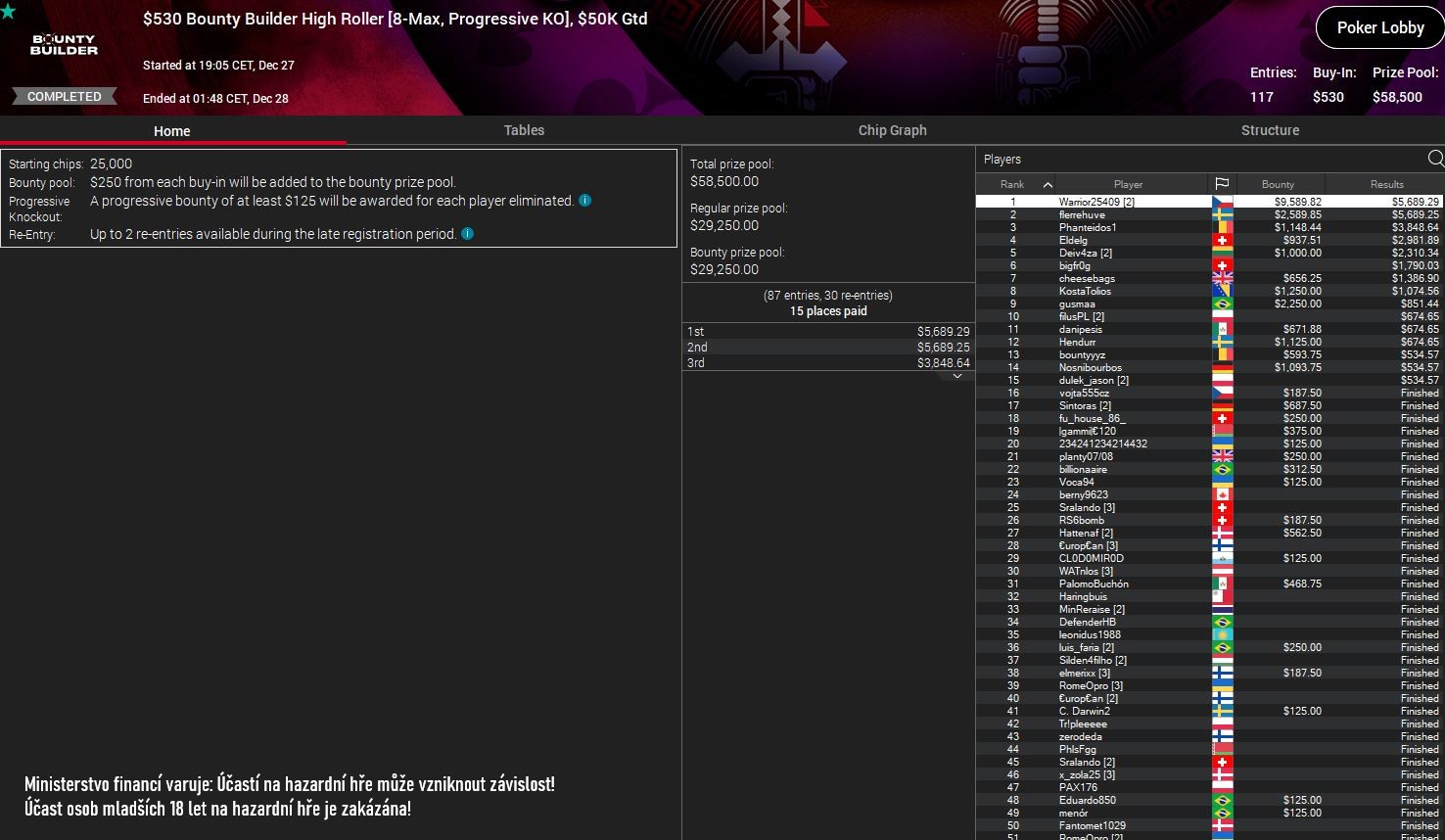 Třetí odstavec pak patří stálicím našich reportů - "Warrior25409" nenašel přemožitele v $320 Daily Supersonicu, za což mu patří odměna $4.584. V "talířáku" - $1.050 New Year Series 33-H řádili "vojta555cz" a "gogac sniper", kteří si připsali 6., resp., 7. místo a oba se tak zařadili do top5 naší tabulky výher.