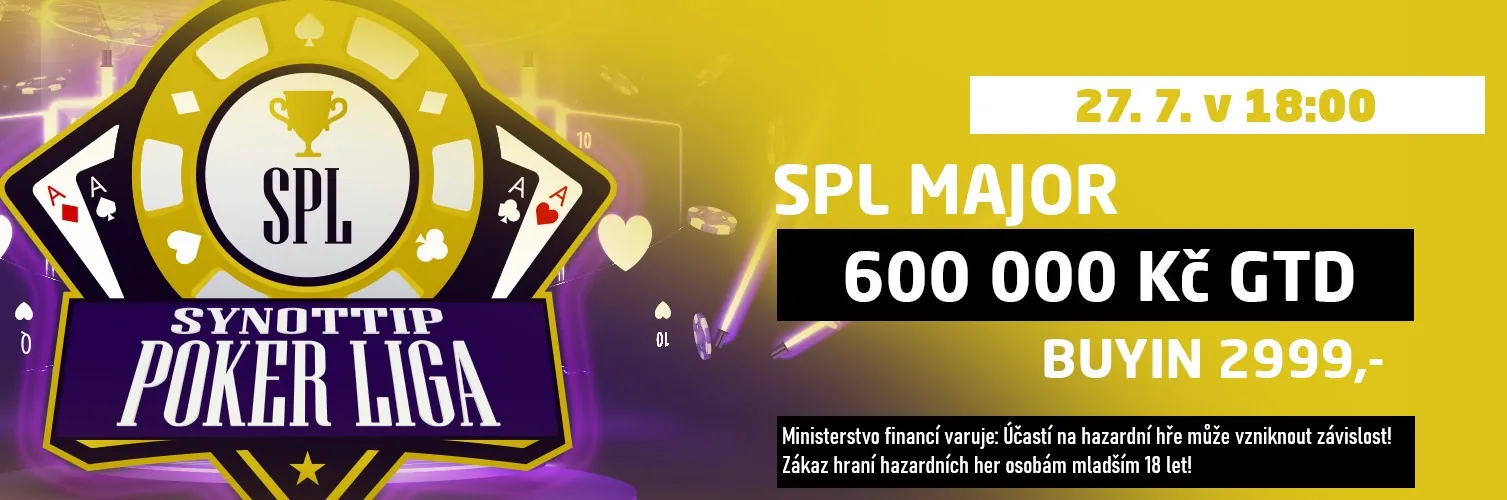Hlavní turnaj tohoto týdne a druhý největší SynotTip event tohoto měsíce dorazí na vaše monitory a displeje v neděli. SPL Major má luxusní garanci 600 000 Kč, která zaručuje, že vítěz vyhraje přes 100 000 Kč. Za tu už se dá pořídit parádní dovolená. Za vstupné 2 999 Kč dostanete do začátku 15 000 v žetonech. Jak s nimi naložíte, je na vás – prostoru pro kvalitní poker bude dost.