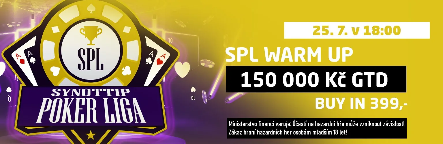 Páteční SPL Warm-Up má skvělý poměr vstupného vůči garanci. Za pouhých 399 Kč si zahrajete minimálně o 150 000 Kč. Pokud jste hledali pokerový turnaj typu bankrollbooster, již nemusíte dál hledat. Start turnaje je naplánován na 18:00 a re-entry lze provádět po dobu 3 hodin.