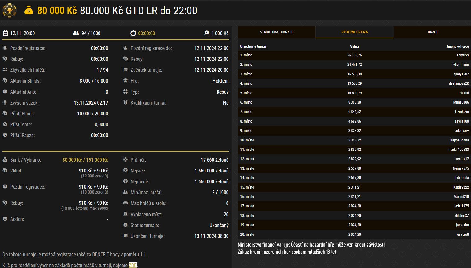 Tabulka výherců největších poker turnajů pracovního týdne na Synottip.cz