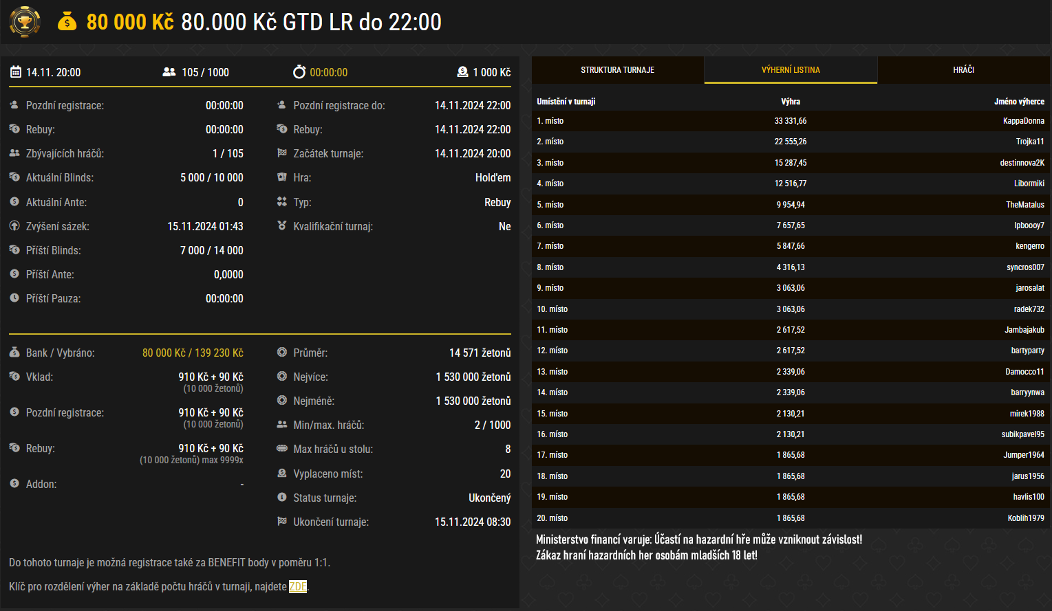 Jak již asi tušíte, turnaj vyhrál hráč KappaDonna, kterého jsme zmínili v úvodu článku. Za porážku všech 125 protivníků si odnesl výhru 68.043 Kč.