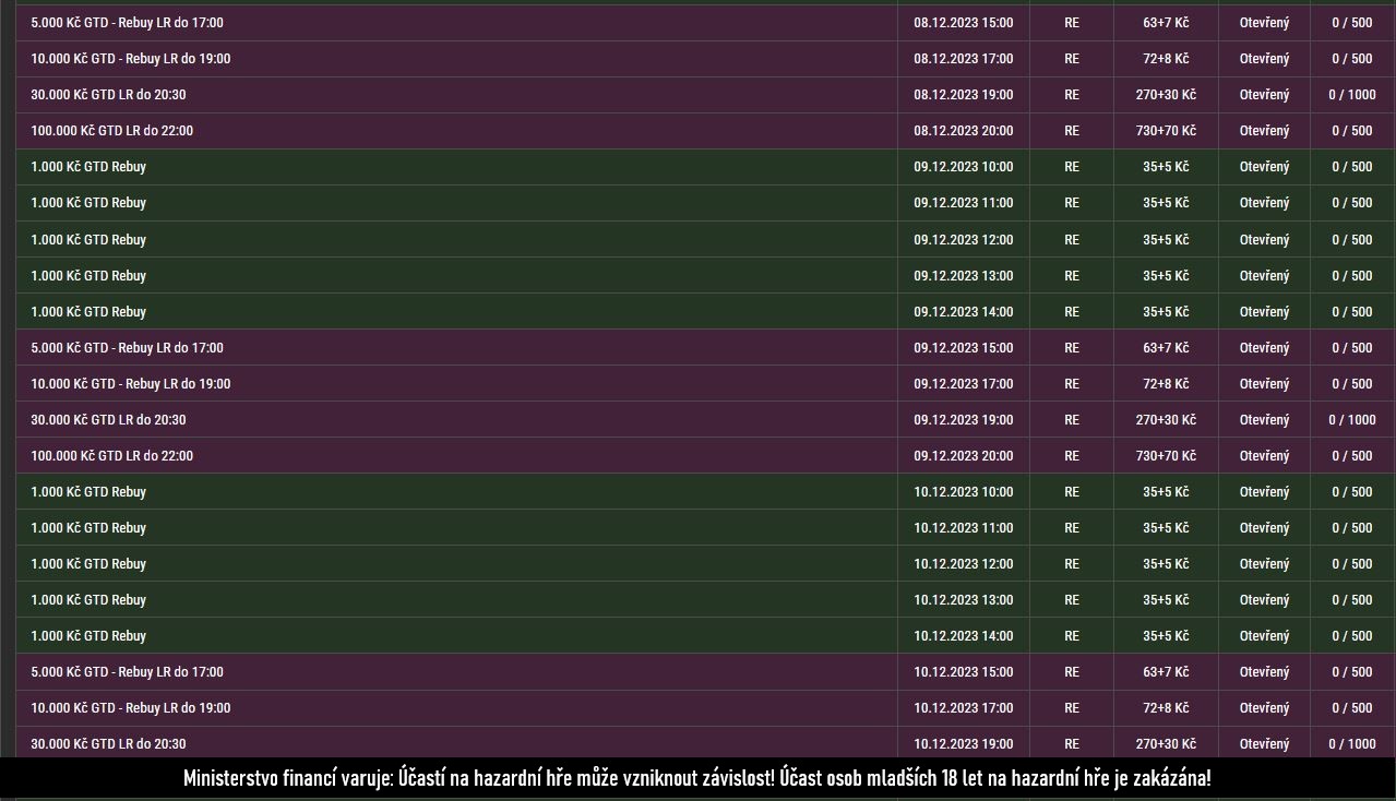 Tabulka výsledků denních major poker turnajů na Synottip.cz