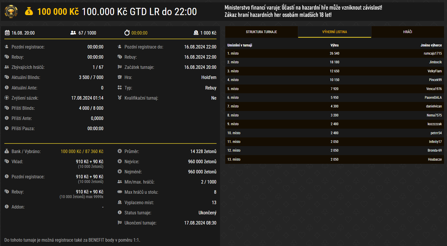 V neděli večer dorazil na monitory a displeje fanoušků online pokeru týdenní major turnaj s buy-inem 1.500 Kč a garancí 300.000 Kč. S jejím vybráním tentokrát nemělo 175 zúčastněných hráčů problém. Na tlačítko „registrovat“ kliknuli hned 222krát, a tak se nakonec hrálo o prize pool 368.550 Kč. Největší výhru v hodnotě 73.746 Kč vydoloval "Rancar007".