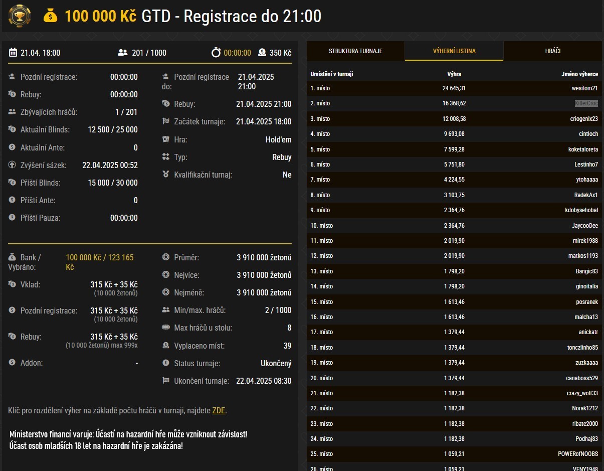 Na placené pozice se probojovali mimo jiné: JakubBurian (32. místo za 936 Kč), crazy_wolf33 (21. místo za 1 182 Kč), malcha13 (16. místo za 1 613 Kč), kdobysehobal (9. místo za 2 364 Kč), koketaloreta (5. místo za 7 599 Kč) a KillerCroc (2. místo za 16 368 Kč).