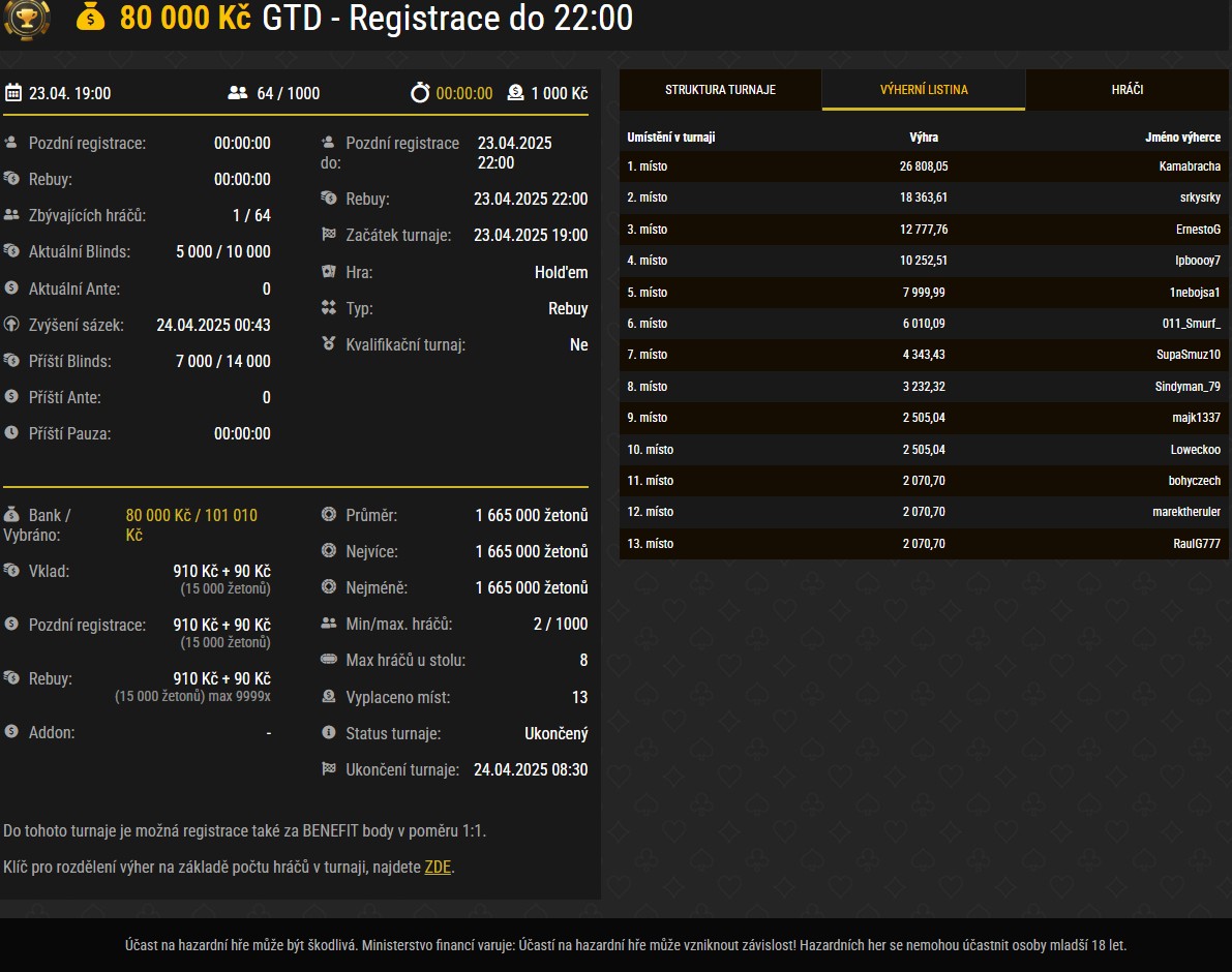 - Neděle 27. 4. 2025 – SPL GRAND, GTD 1 000 000 Kč, buy-in 3 499 Kč