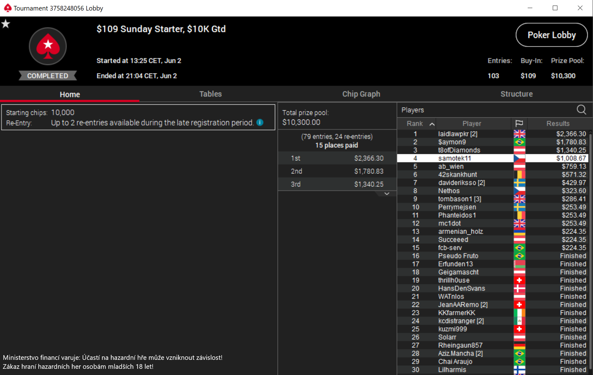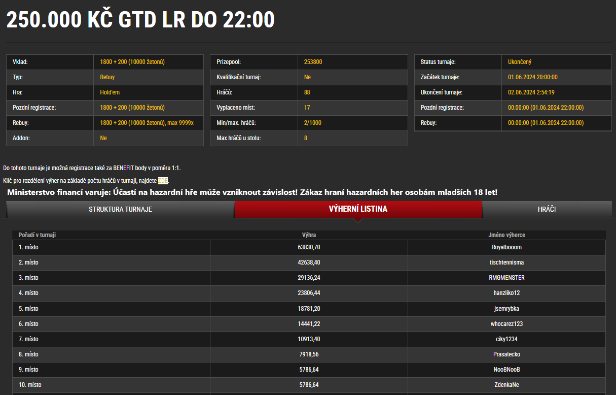 Na závěr stanul na stupni vítězů "Royalbooom" a svým výkonem si zajistil 63.830 Kč. Za zmínku stojí i výkon hráče "whocarez123", který v současnosti vede výše zmíněnou Pokerman Ligu. V tomto turnaji získal 6. příčku.