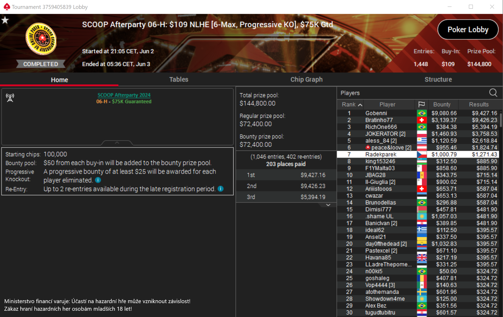 Více než dvojnásobek si připsal "Radekparek". Tomu se zadařilo v jednom z afterparty SCOOPů a za zářez 7. místa obdržel $2.227.