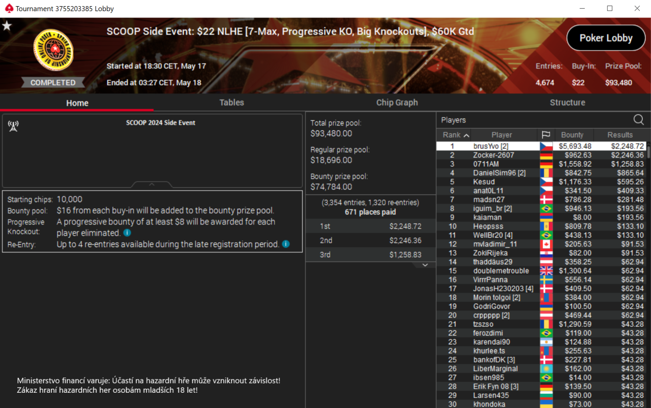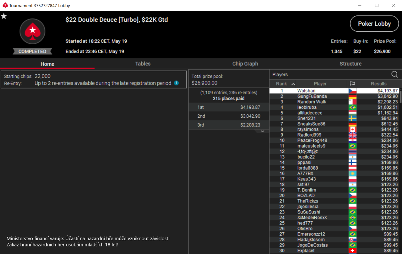 Největší trefu, zároveň první příčku, v turnaji s buy-inem pouhých $22, vybrousil hráč s nickem "brusYvo". Poté co porazil více než 4,5 tisíce hráčů, nabouchal svou pokerovou peněženku o téměř $8.000, což je více než 200.000 Kč. Ale jak vidíte, v tomto turnaji se dobře dařilo i dalším zástupcům našich barev.