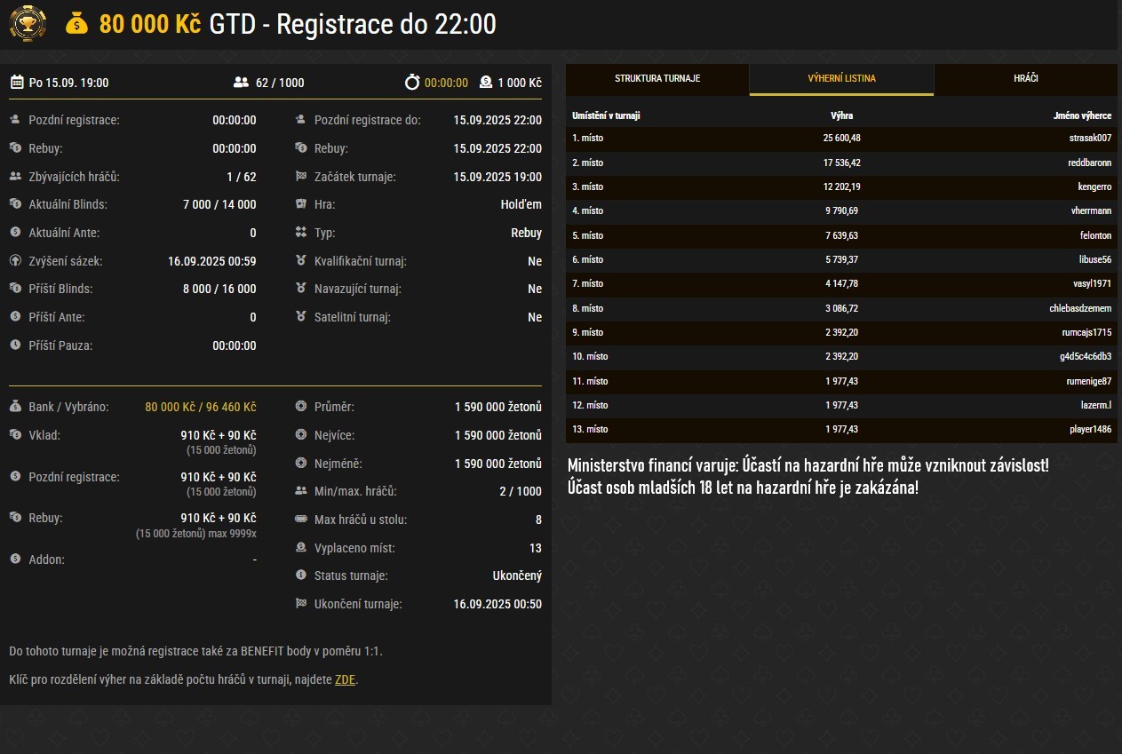 Největší z pravidelných turnajů uplynulého pracovního týdne, co se prize poolu týče, vyhrál Strasak007. V pokladně mu po zdolání všech 61 protihráčů zacinkalo 25 600 Kč.