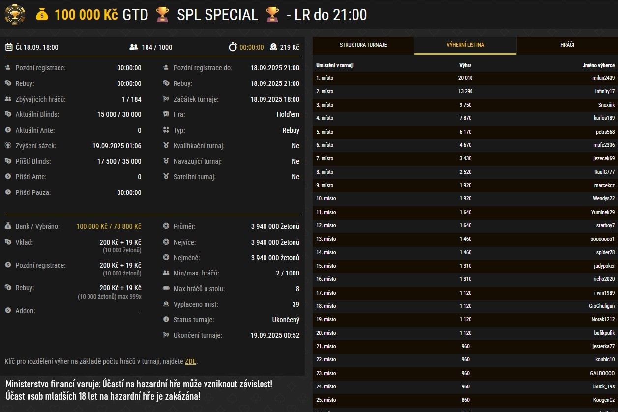 Bankroll nakrmilo 39 nejlepších hráčů, z nichž si největší odměnu připsal na svůj účet milan2409, jenž se může radovat z 20 010 Kč.