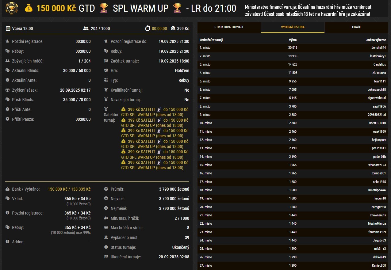 Jako ve čtvrtečním turnaji i v pátek se rozdělil prize pool mezi 39 hráčů. Turnajové prvenství ověnčené prémií 30 015 Kč vybojoval Jonshell44. Do ITM se dostali např. CZpecaCZ (28. místo za 1 290 Kč), KulotripoAAA (18. místo za 1 680 Kč), Horst101010 (10. místo za 2 880 Kč), fear1111 (5. místo za 9 225 Kč), Cardelius (3. místo za 14 625 Kč) a lastdonkey1 (2. místo za 19 935 Kč).