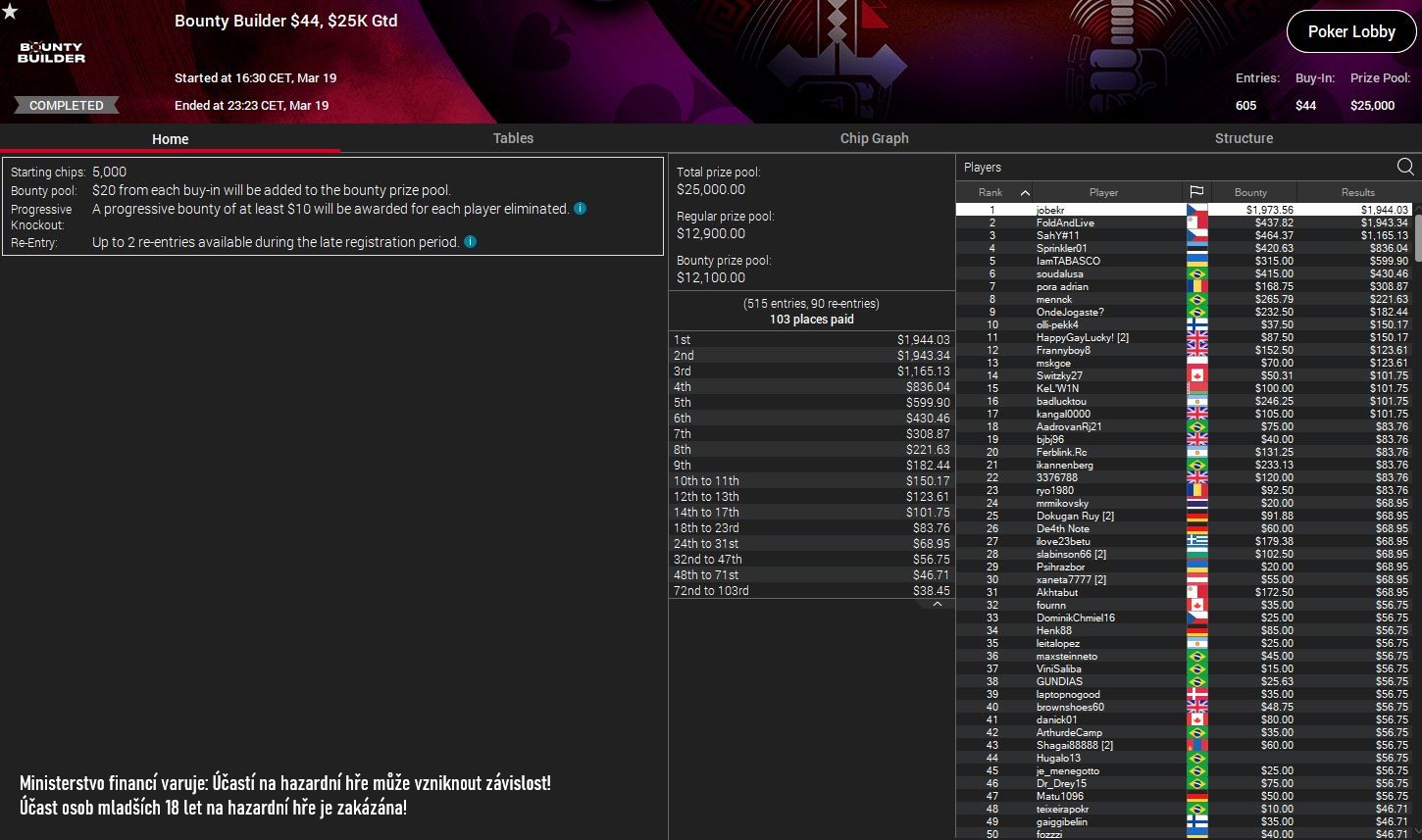 Do třetice všeho dobrého si uvedeme úterní trefu "jobekra". Tomu přistálo v bankrollu $3.917 za první místo v poker turnaji Bounty Builder $44, $25K GTD. Pokud byste se chtěli podívat na rozhovor s jedním z nejlepších českých hráčů pokeru můžete kouknout zde - Rozhovor s poker profesionálem Josefem "Jobekrem" Šnejbergem