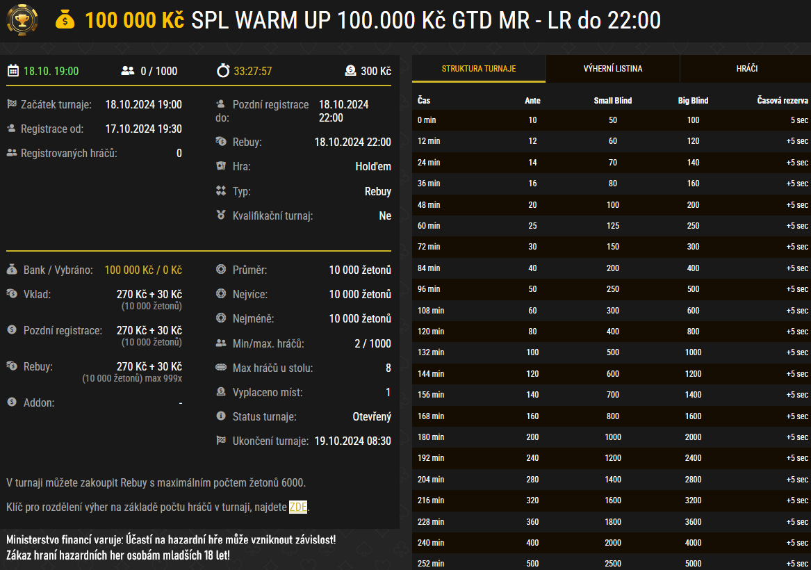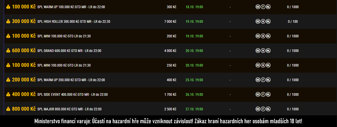 Říjnová SPL začne pátečním turnajem SPL Warm-up se zajímavým poměrem buy-inu a garance. Za vstupné 300 Kč se hraje o garantovaný balík odměn v celkové výši 100.000 Kč. Podobné turnaje jsou na Synot Tipu velice oblíbené a očekává se, že se vybere mnohem větší prize pool.