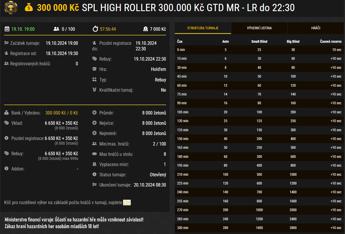 Hlavní turnaje první dávky říjnové Synottip Poker Ligy nabídnou celkovou garanci 900.000 Kč. O část této garance se jako první přihlásí hráči vyšších stakes. Pro ně je na sobotní večer 19. 10. 2024 připraven turnaj s garancí 300.000 Kč a buy-inem 7.000 Kč.