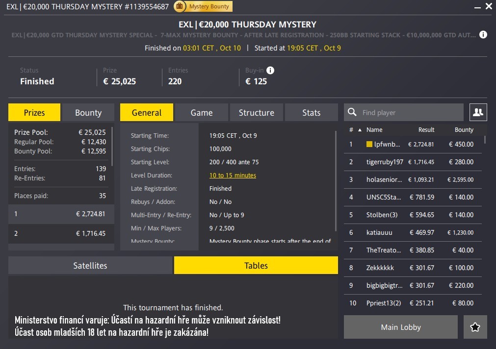 Parádní výhru poslal do svého bankrollu hráč Lpfwnb7. V pondělním turnaji EXL Thursday Mystery s GTD €20 000 za sebou nechal všech 220 entries a buy-in €125 proměnil na €3 187.