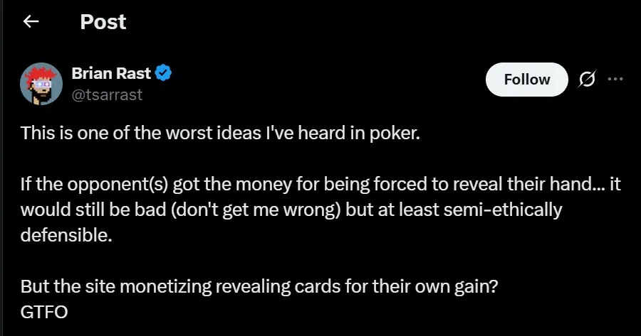 Brian Rast označil funkci za jeden z nejhorších nápadů v pokeru, o kterém slyšel.