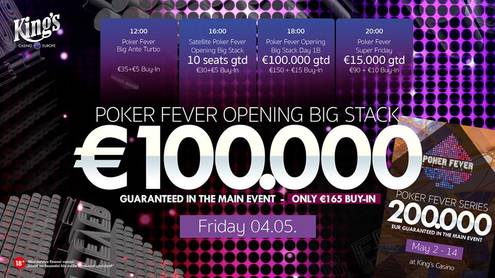 Do King's totiž vůbec poprvé dorazil festival Poker Fever Series a během nadcházejících dvou týdnů se v Rozvadově bude rozdělovat více než půl milionu krásných garantovaných eur. Na €165 Poker Fever Opening Big Stack připadá značná část této sumy, při zachování nízkého buy-inu se mezi nejúspěšnější hráče bude rozdělovat při nejmenším garantovaných €100.000. Stále ještě máte dost času se do soubojů o zajímavý prizepool zapojit, naplánováno je totiž celkem pět startovních flightů. Ten první už je nicméně minulostí, odehrán byl v průběhu včerejška.