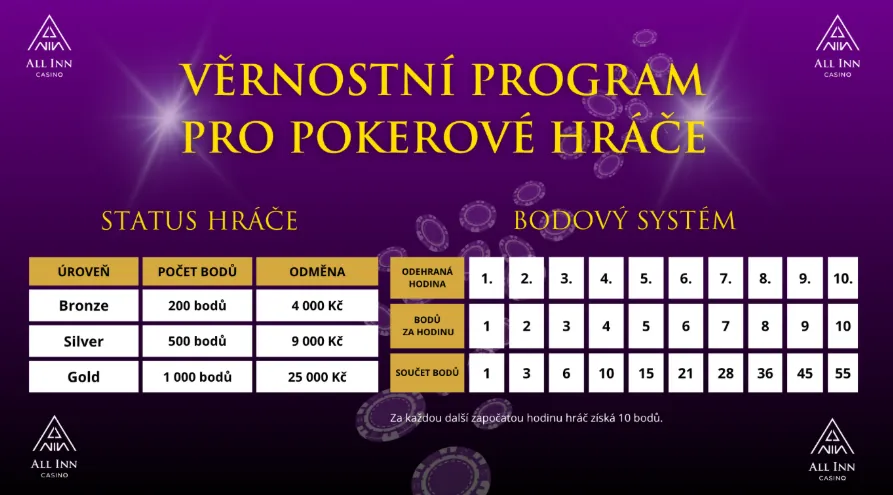 ALL INN CASINO se v poslední měsíci hlásí o slovo na pražské pokerové scéně. Nabízí nejen příjemné prostředí a profesionální servis, ale také turnaje, které dávají smysl – s férovými strukturami, rozumnými časy a atraktivními garancemi. THE MONDAY WIN @ ALL INN je ideální způsob, jak nastartovat týden – ať už si jdete pro zábavu, nebo pro výhru. Pro cashgame hráče máme nachystaný progresivní systém odměn založený na počtu odehraných hodin v pokeru. Hráči sbírají body a postupují na jednotlivé úrovně, které přinášejí štědré finanční odměny.