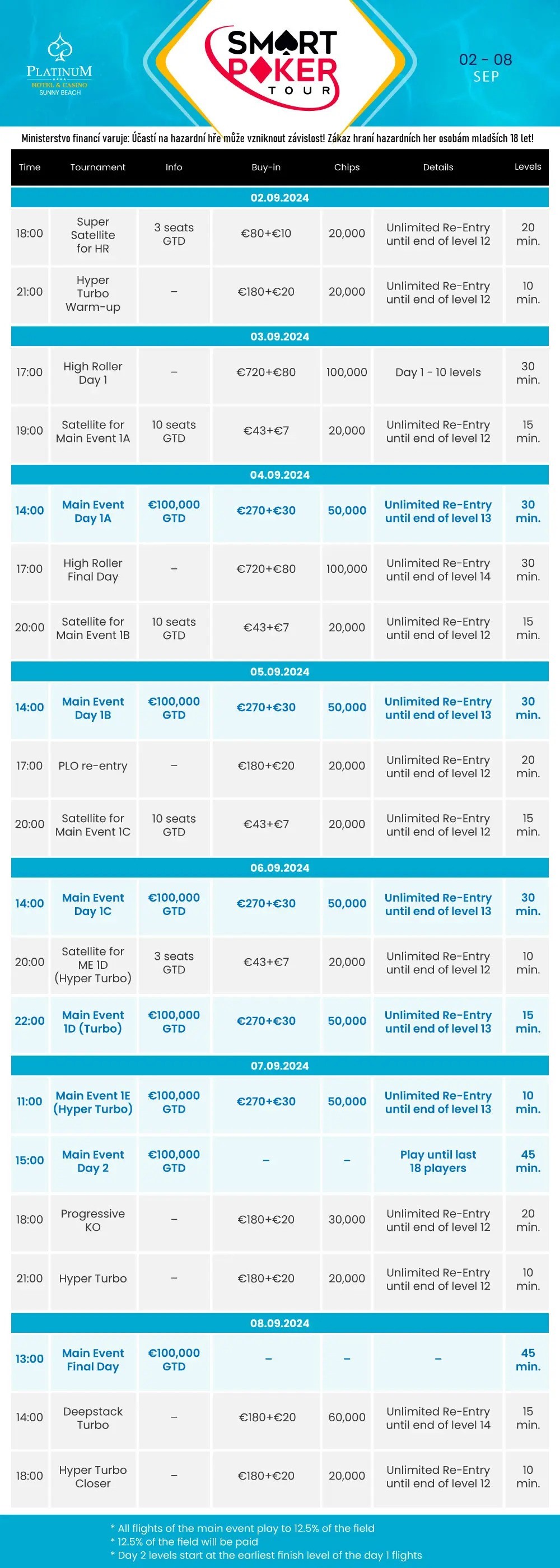 Bulharské přímořské letovisko Slunečné pobřeží má bezpochyby své kouzlo a to nejen pro dovolenkáře. Hráči si zde budou moci užít pokerovou dovolenou na začátku září, kdy tu má zastávku Smart Poker Tour, která se točí především kolem jejího Main Eventu s garancí €100.000 při buy-inu €300. Tento festival se bude konat od 2. do 8. září.