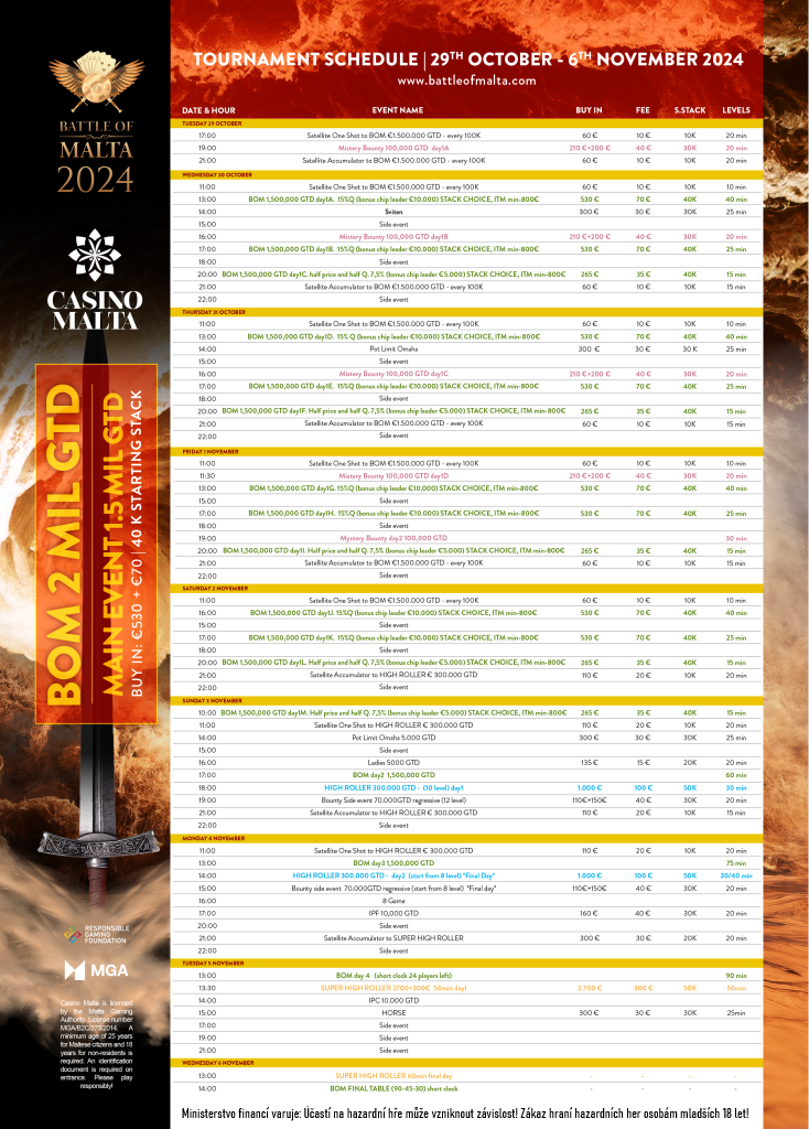 Battle of Malta je jedním z nejoblíbenějších evropských festivalů. Tento kultovní turnaj může letos opět zvýšit pomyslnou laťku, když se organizátoři opět rozhodli stanovit garanci celého festivalu na fantastické €2.000.000! Samotný Main Event bude při buy-inu €600 garantovat €1.500.000 a dalších €500.000 bude rozděleno v garancích vedlejších turnajů. Tradiční podzimní vydání Battle of Malta se tentokrát uskuteční od 29. října do 6. listopadu v prestižním kasinu Malta.