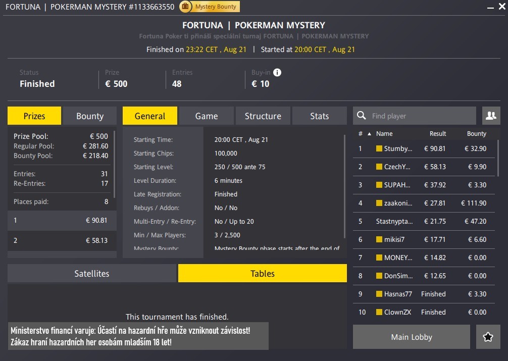 Pokerman Mystery vyhrál Stumby1893, největší bounty bral Zaakonik