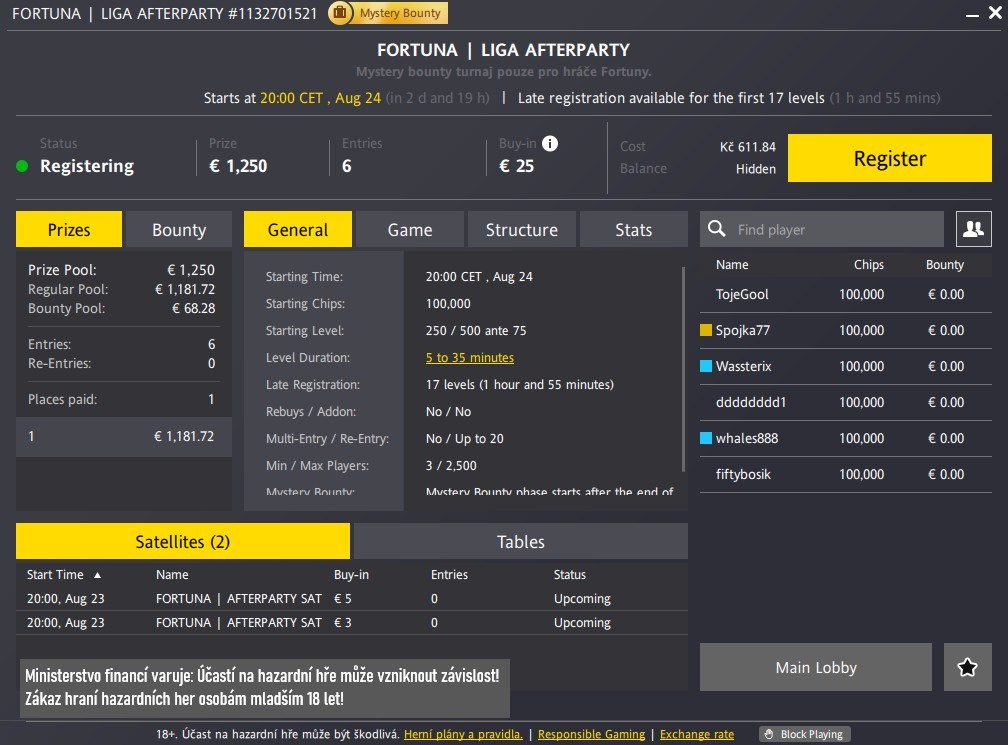Fortuna Poker Liga je sice za námi, ale pokerová párty pokračuje. V neděli 24. srpna si můžete zahrát Afterparty turnaj s garancí €1 250 a buy-inem €25.