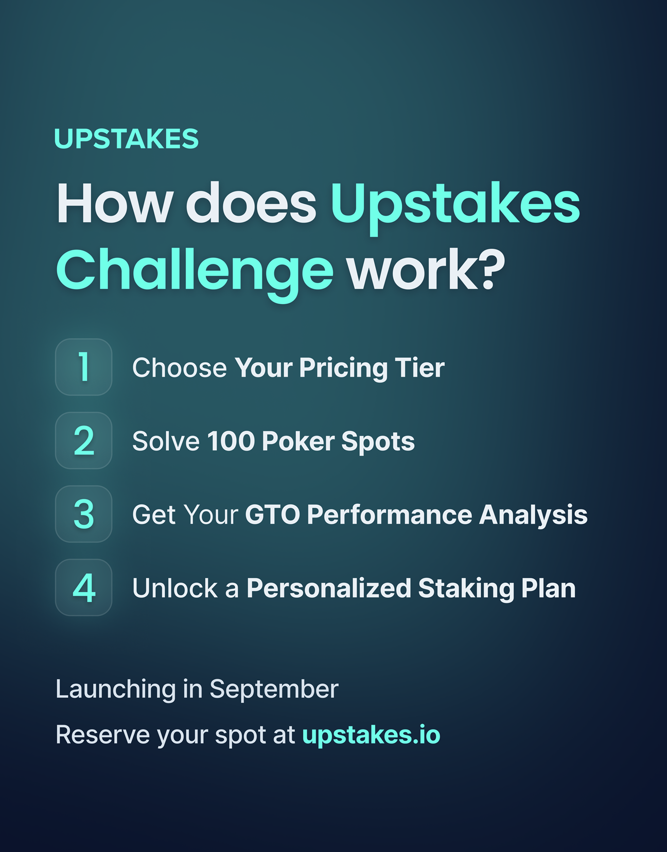 Po vybrání úrovně zaplatíte vstupní poplatek a můžete začít plnit challenge, která obsahuje 100 simulovaných poker spotů, ve kterých je úspěšnost hodnocena na základě GTO (Game Theory Optimal). Hráči, kteří splní v challenge stanovené skóre, se pak mohou těšit na individuální stakingový plán podle úrovně, kterou zvolili na začátku.
