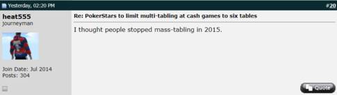 „Zároveň ale očekáváme, že se hráči, kteří v současnosti hrají více než šest stolů, změně zvládnou přizpůsobit a v konečném důsledku budou na dostupných stolech vydělávat více peněz. Ve světle předchozích změn očekáváme, že větší zisky budou dosaženy hraním širší range rukou a aktivnější hrou, což povede k tomu, že si hru více užijí všichni zúčastnění hráči."
