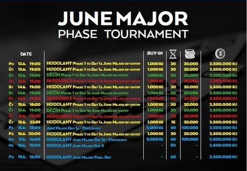 Turnaj má před sebou poslední, v pořadí jedenáctou, Phase 1, která se rozehraje v pátek 16. června úderem 20. hodiny večerní v hodolanském kasinu. Startovní stack je nastaven na 20.000 v žetonech, levely jsou 30minutové a 20 % nejúspěšnějších hráčů si zajistí postup do sobotního startovního flightu 1b. S nashromážděným stackem se do hry vrátí při blindech 600/1.200, ante 200.