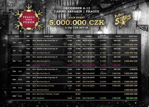 Do krásných prostor barokního paláce nacházejícího se v ulici Na Příkopě mohou příznivci pokeru zavítat na akci Prague Xmas Poker, jejíž ozdobou je Main Event s dostupnou cenovkou 5.500 Kč a štědrým, jak se ostatně na předvánoční období sluší a patří, garantovaným prize poolem ve výši rovných 5.000.000 Kč. A komu by se chtělo, může se přímo na místě dění pokusit zdolat nástrahy některého z kvalifikačních turnajů, v rámci nichž se bude rozdávat nejméně 25 lístků do hlavního turnaje.