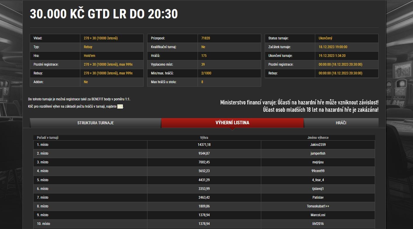 Ve druhém největším denním major turnaji s GTD 30.000 Kč a buy-in 300 Kč si o největší bank zahráli hráči v pondělí. Turnajová garance se přebrala více než dvojnásobně a mezi hráče se nakonec rozdělovalo 71.380 Kč. Největší část z prize poolu putovala do bankrollu hráče "Jakiro2359". Radovat se může z 14.371 Kč.