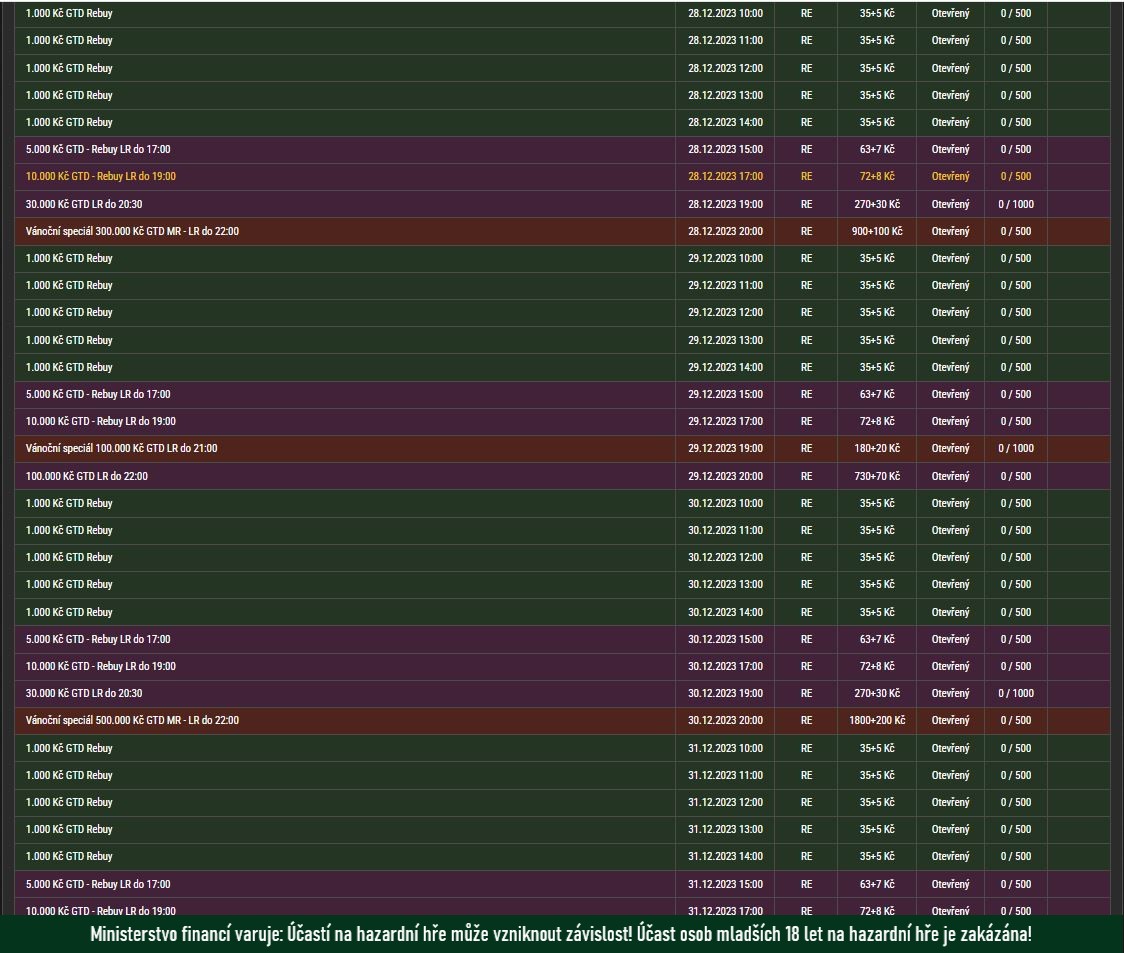 V úterý 26. 12. 2023 se například můžete těšit na turnaj s GTD 300.000 Kč a buy-inem 1.000 Kč. Vrcholem série vánočních speciálů je turnaj s GTD 500.000 Kč a buy-inem 2.000 Kč, jenž se odehraje v sobotu 30. 12. 2023 Zkusíte si zahrát i vy?
