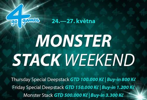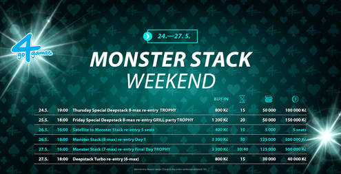0Od čtvrtka 24. 5. začíná Monster Stack Weekend s celkovou garancí turnajů téměř 800.000 Kč. Hlavní dvoudenní turnaj Monster Stack s garancí 500.000 Kč se odehraje v termínu 26. – 27. 5. Buy-in do turnaje činí 3.300 Kč a počáteční stack je 125.000 v žetonech. Sobotní Day1 začne v 18:00 a hrát se bude v 30minutových levelech. Pozdní registrace je možná do 14. levelu (v neděli do 16:40) a první den se hraje do konce 13. levelu. Nedělní Final Day začne v 16:00 a blindy se navyšují po 30 a 40 minutách. Na vítěze čeká trofej.