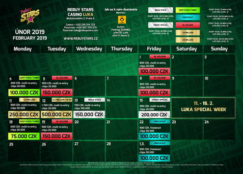 Ani v únoru nechybí pravidelné turnaje každé pondělí, úterý a pátek. Pražská Luka ale kromě klasických formátů rozhýbe i Luka Special Week o 1.100.000 Kč! O pohádkové odměny máte šanci bojovat ve čtyřech turnajích v termínech od 11. do 15. února: