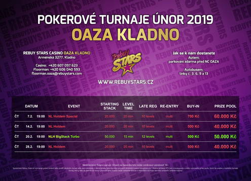 - Čtvrtek 21. února budeme hrát NL Holdem s cenovkou 100.0000 korun za buy-in 2.500 korun.