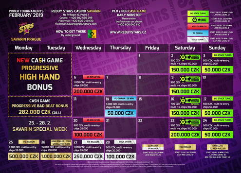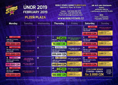 - Ve čtvrtek 14. února přinášíme MEGA Stack o prize pool 200.000 Kč. Na pokladně vyměníte vstupenku do turnaje za buy-in 1.500 korun. Starting stack je luxusních 50.000 žetonů.