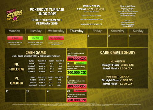 - Čtvrtek 28. února se nese ve znamení BIG Thursday o celkem 250.000 korun. Za buy-in 5.500 korun získáte 30.000 žetonů.