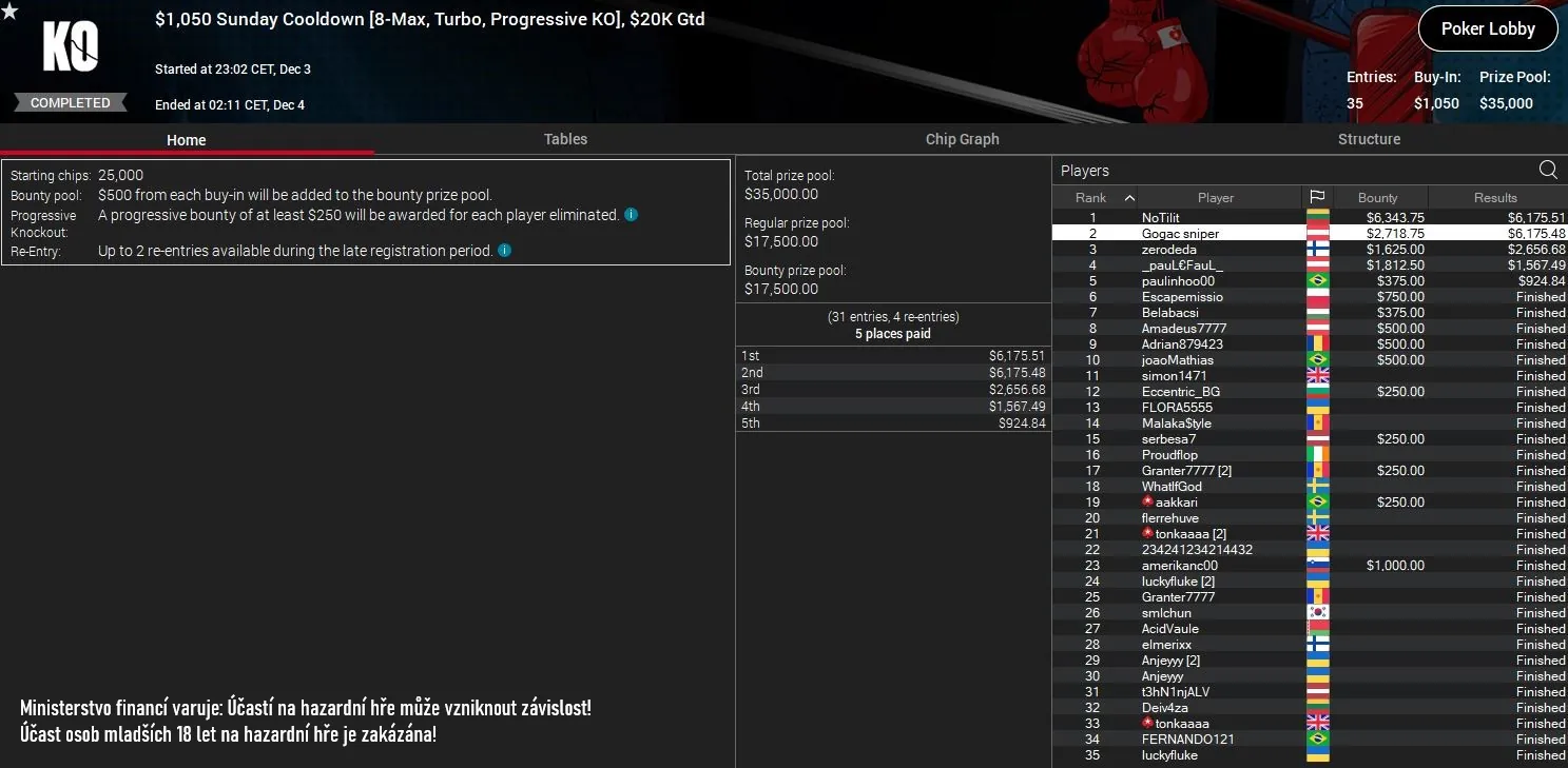 Na peníze se mohlo těšit 55 hráčů. Nejmenší vyplácená částka činila 6.207 Kč a vítěz se mohl těšit na rekordní odměnu v hodnotě téměř 250.000 Kč! Do peněz se dostala i řada tamních regulárů - "kapito94" (7. za 41.169 Kč), influencer "Prasatecko" (16. za 14.567), "ZdenekMital12" (26. za 9.753Kč ), "to_je_fer" (39. za 7.347 Kč) a další.