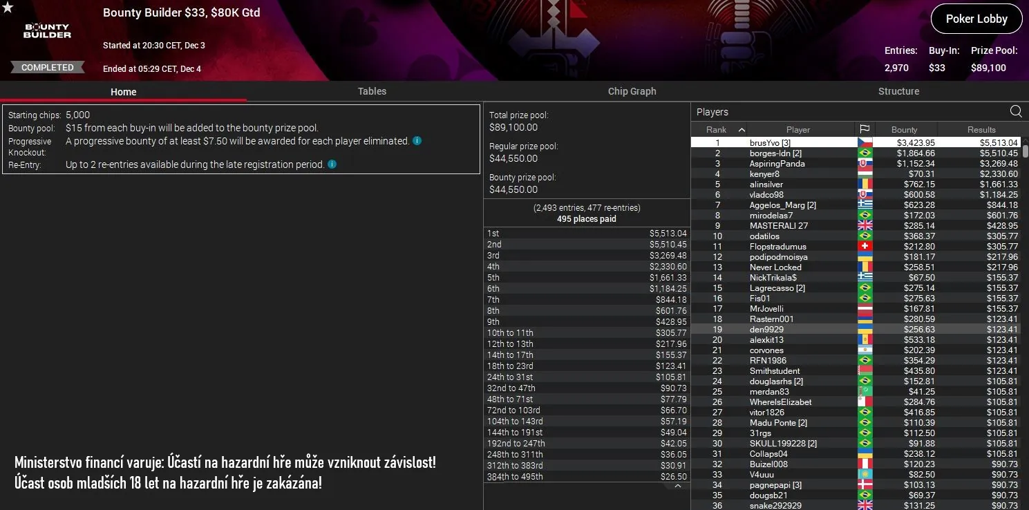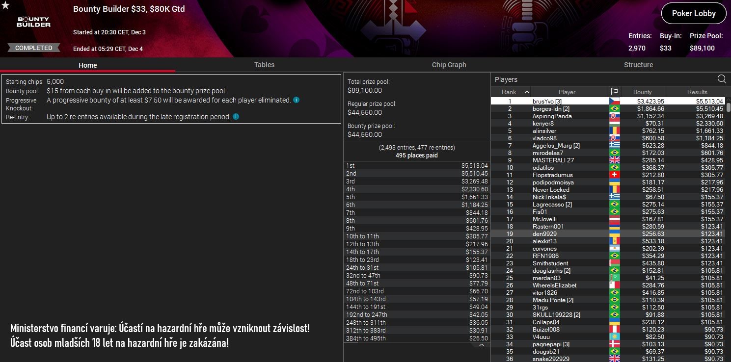 Největší víkendovou PS trefu, kterou se nám podařilo dohledat, zařídil hráč "brusYvo". V turnaji $33 Bounty Builder (PKO) $80K GTD za sebou nechal všech 2.969 protihráčů a připsal si výhru $8.936.