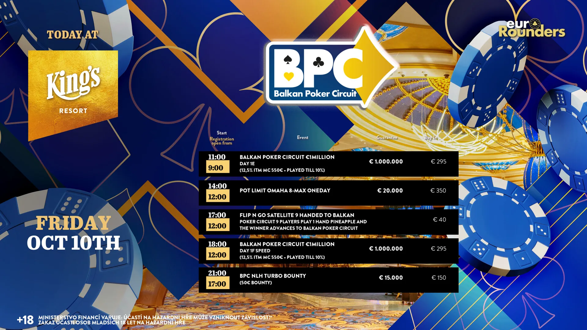 0Turnaj s milionovou garancí – Balkan Poker Circuit aktuálně vévodí programu poker turnajů rozvadovského King’s Casina. Pojďte s námi zjistit, jak to s turnajem vypadá po čtyřech startovních flightech.