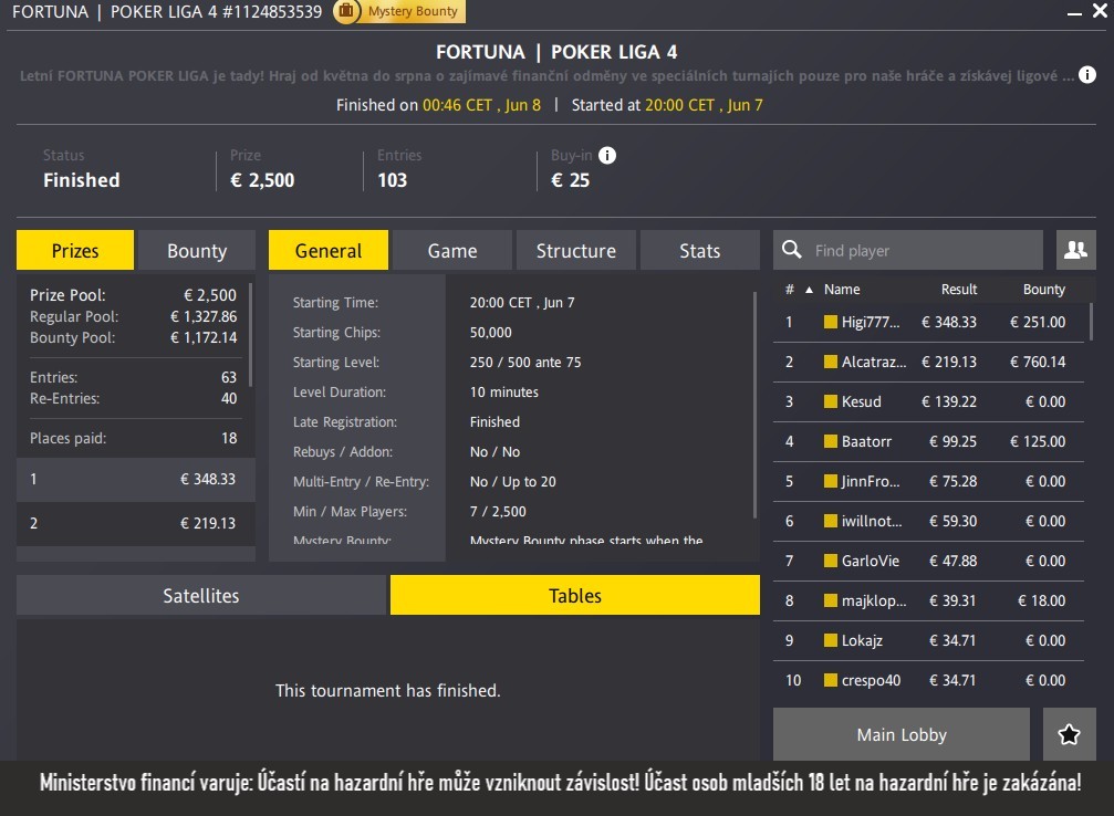 0Čeští hráči váleli o víkendu na Fortuna Pokeru. Podruhé v řadě můžeme slavit titul v jednom z hlavních turnajů Elite Series díky úspěchu hráče StevenaWagnera. Fortuna Poker Ligu zcela ovládl Higi777, který vyhrál oba víkendové turnaje, a další zajímavé ITM výsledky přidali Mejrijou, Jardahruska, Kesud a další hráči, kteří se mohou radovat ze čtyřciferných výher. Pojďme se na ně mrknout.