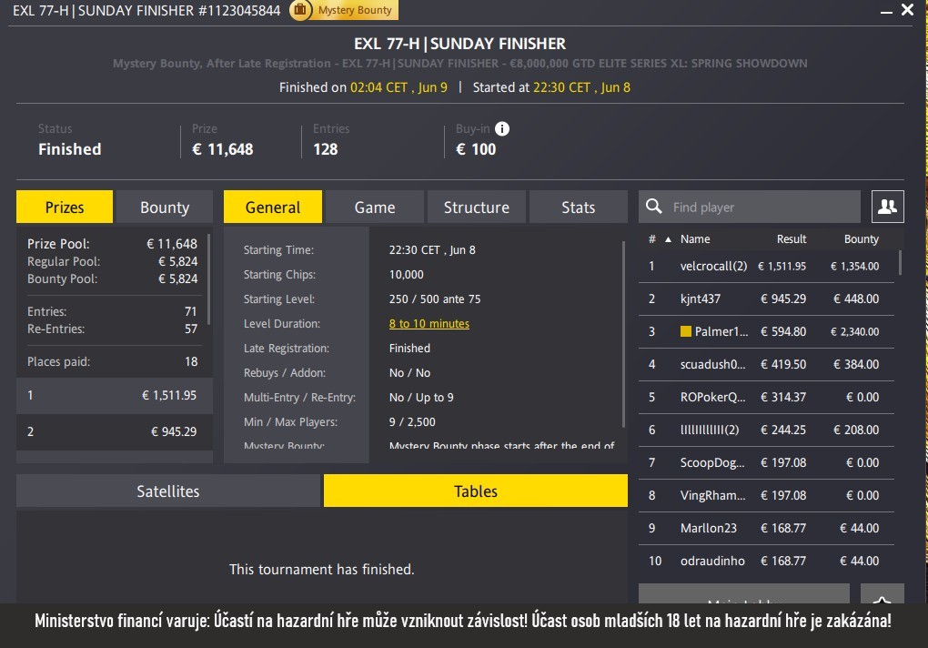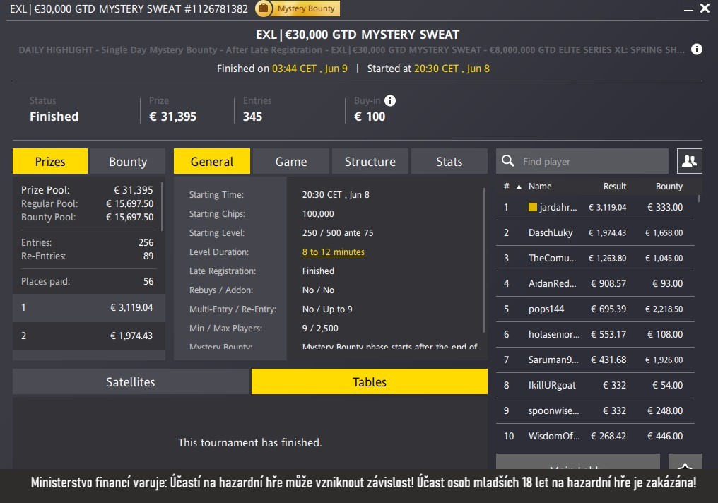 Bohatě nakrmil svůj bankroll i Jardahruska. Jarda dokázal proměnit buy-in €100 do poker turnaje EXL Mystery Sweat s garancí €30 000 na jedničku a za zdolání všech 256 protihráčů bral €3 452.