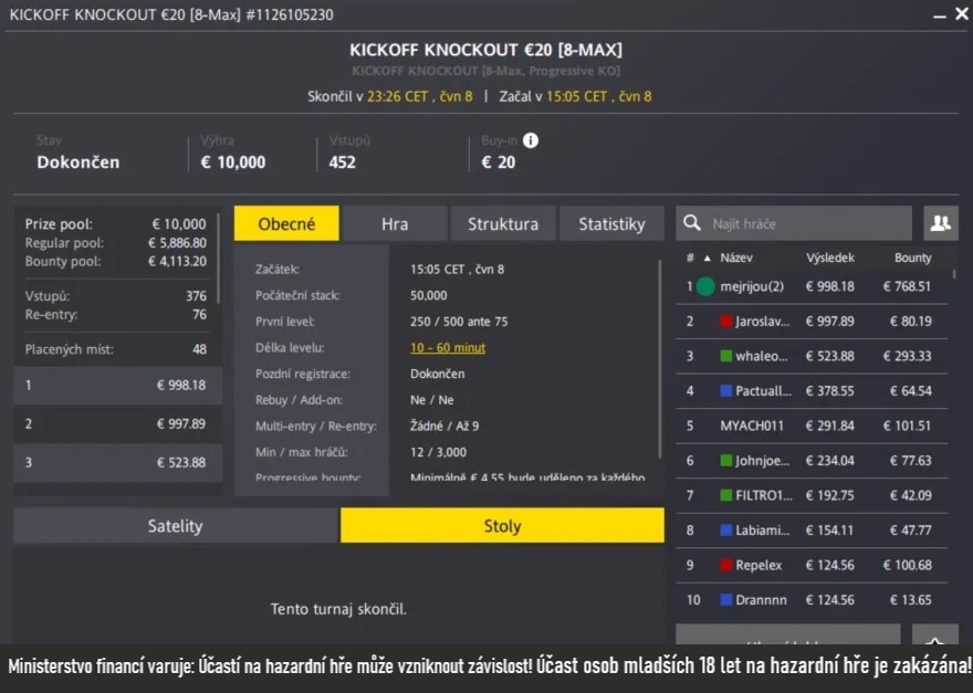 Osm a půl hodiny trvalo, než si Mejrijou poradil se všemi 376 protihráči v online poker turnaji Kickoff Knockout s garancí €10 000 a vstupným €20. Odměna ale stála za to! Za první místo inkasoval €1 166.