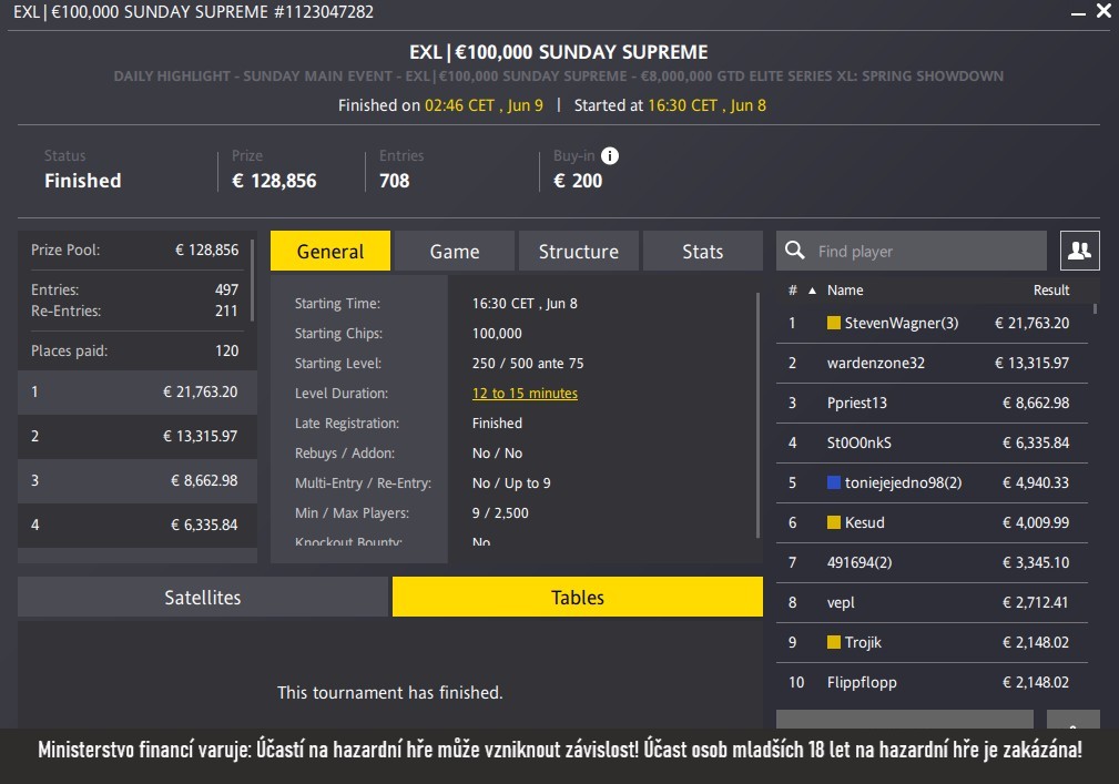 Se Stevenem se na finálový stůl podívali ještě další dva čeští hráči – Kesud (6. místo za €4 009) a Trojik (9. místo za €2 148).