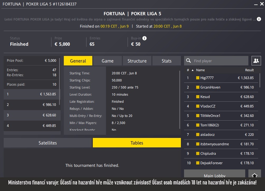 Vybrané výsledky online turnajů na Fortuna Pokeru víkend 6. - 8. května