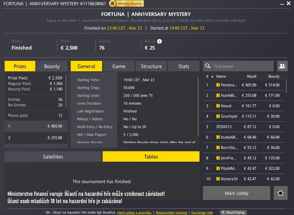 Velkolepé oslavy jednoho roku pokeru na Fortuně přinášejí fanouškům online pokeru nejen spoustu soutěží, bonusů a misí o vstupenky, ale také speciální výroční turnaje. V neděli se například odehrál Ann1versary Mystery s GTD €2 500 v oblíbené variantě Mystery Bounty.